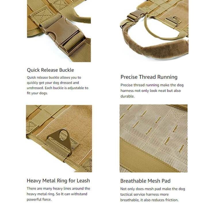 The Tactical Dog Harness Adjustable Training Molle Vest with 3 Detachable Pouches is made of army 1000D nylon which has high quality and scratch resistant. Each strap can be adjustable for wearing stability and comfort, reducing the rask of Abrasions to their bodies. It is ideal for outdoor activities and training. Both sides of the dog harness are molle-type design. It comes with 3 detachable pouches which can be added on the vest. HOOk&LOOP panel on the top and detachable pouches is for ID Badges. You can DIY your dog's own style. Putting it on, your dog will look very handsome and cool.